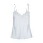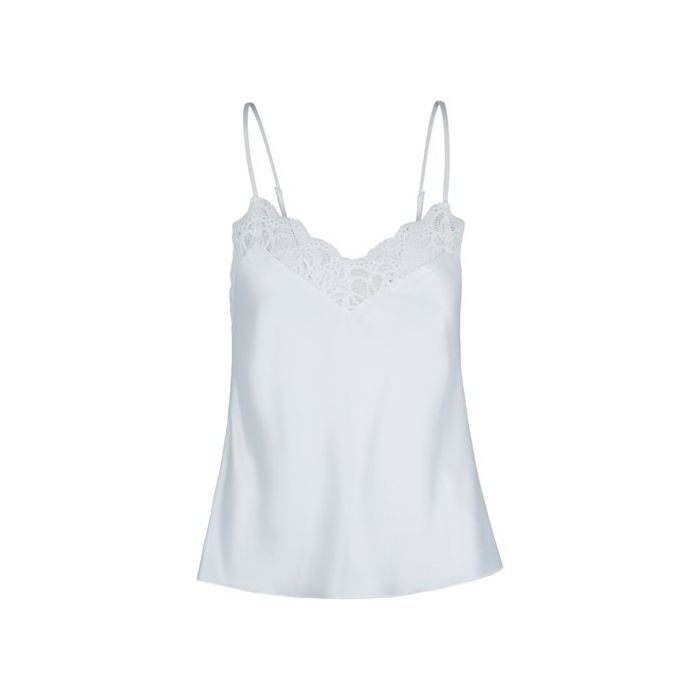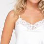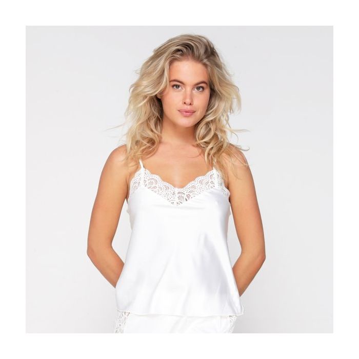 De top heeft een soepele pasvorm en smalle spaghettibandjes die te verstellen zijn. De charmante V-hals is afgezet met een boord van romantisch kant met golvende randjes. In de achterkant is zacht micro mesh ingezet in een stijlvolle V-vorm.