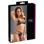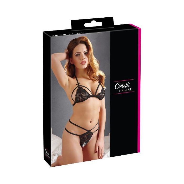 Dit extravagante setje van Cottelli Collection is 2-delig en heeft een zeer verleidelijke uitstraling. De halter bh heeft zachte cups gemaakt van zwart kant. In een handomdraai haal je de cups los om je borsten te onbloten en je partner direct op te winden. De sexy string heeft dubbele taillebandjes afgewerkt met strikjes en een open kruis waarmee jij kunt laten zien dat jij je partner direct moet hebben. In deze set is verleiden niet nodig de boodschap komt luid en duidelijk over.