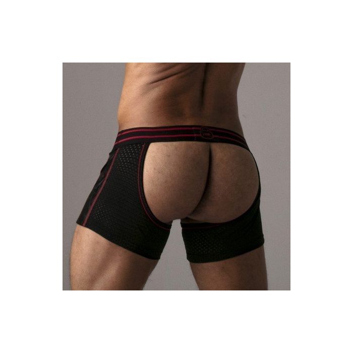 Deze chaps heeft een sportief uiterlijk door het gebruik van mesh en een stevige, elastische tailleband. Het middenstuk ontbreekt, zoals bij de oorsprinkelijke chaps. Dit zorgt voor een heel sexy en toegankelijk model.