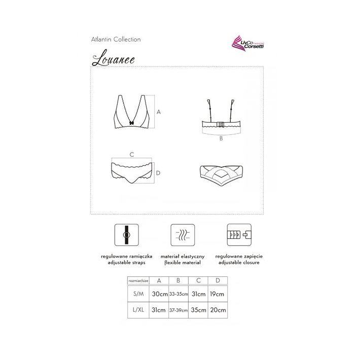 De verleidelijke lingerie set Louanee komt uit de Atlantin lijn van het merk Livco Corsettie en bestaat uit een bralette bh en een bijpassende hipster string. De bh is niet gevoerd en is beugelvrij voor een super sexy natuurlijke look. De hipster string zit lekker laag om de heupen en laat de billen heel mooi uitkomen. Het zachte bloemen kant schijnt door en voelt bovendien heerlijk zacht aan.