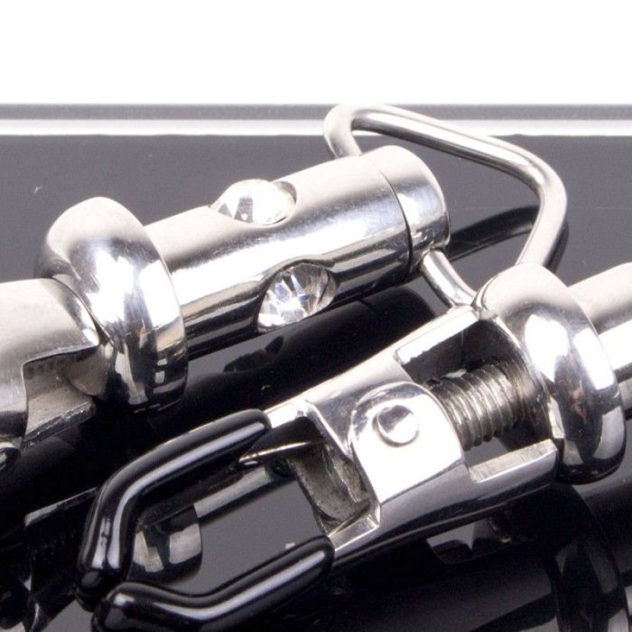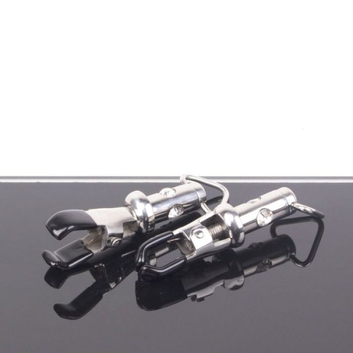 Versier je tepels met deze prachtige tepelklemmen. Je lover weet niet wat hij ziet wanneer jij de slaapkamer inloopt met deze luxe tepelklemmen met diamantjes vastgeklemd op je stijve tepels. De klemmen zijn aan te draaien zodat jij zelf kan bepalen hoe strak ze zitten. Aan de uiteinden van de tepelklemmen zitten rubberen nopjes zodat ze goed stevig blijven zitten en zodat het de huid niet zal beschadigen. De tepelklemmen zijn versierd met 3 diamandjes rondom om het geheel een luxe uitstraling te geven. Draag bij een open bh of wanneer jullie in zijn voor het echte bdsm werk.