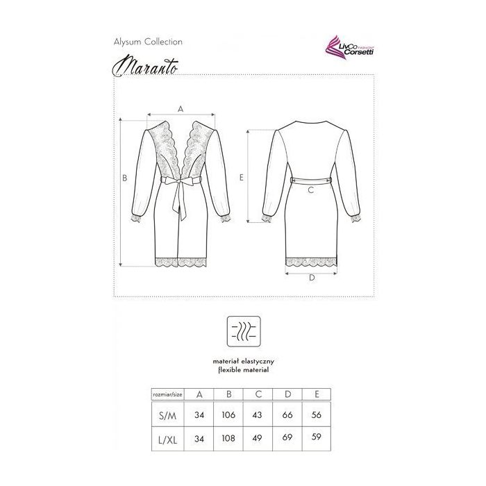 De Maranto Peignoir is een elegante creatie uit de collectie van Livco Corsetti. Deze peignoir is gemaakt van zwart satijn met details van romantisch kant. Op het glanzende satijn is een print van bloesems van de Japanse kers afgebeeld voor een sprookjesachtige lente look.