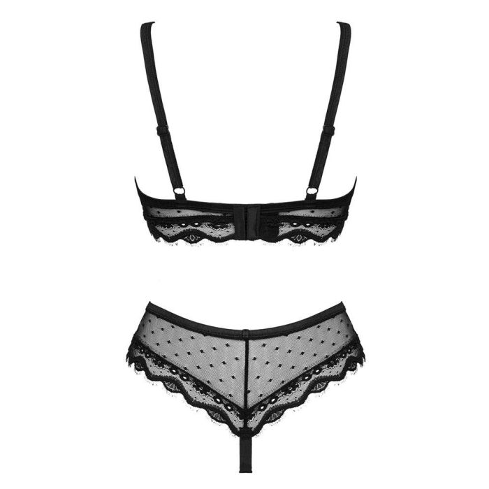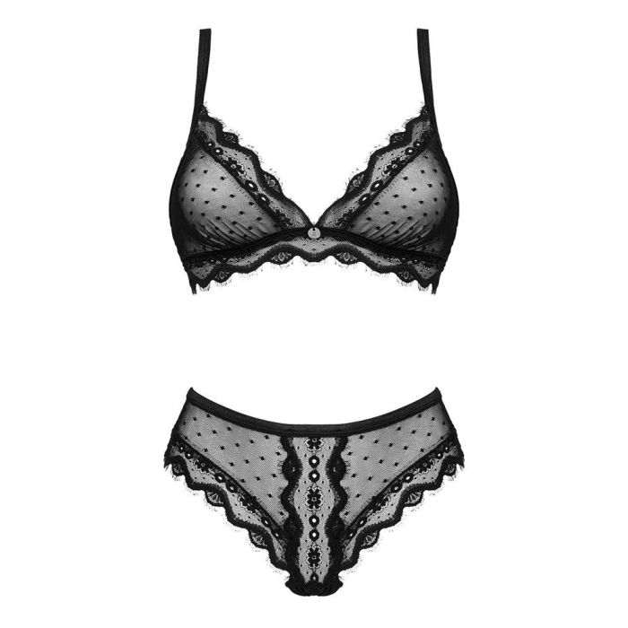 Ga voor stijlvolle verleiding! Deze lingerie set van het merk Obessive bestaat uit een bh en bijpassende string in een prachtig dot motief. Daarnaast heeft deze set ook prachtige accenten van delicaat wimperkant en daardoor krijgt deze lingerie set een luxe uitstraling. De set is zijdezacht en elastisch waardoor het draagcomfort erg hoog is. De beha heeft een decoratief element tussen de softcups en de bandjes zijn volledig verstelbaar. De bijpassende string zal bij jou hoog scoren dankzij de goede pasvorm waardoor je billen op een spannende manier benadrukt zullen worden.