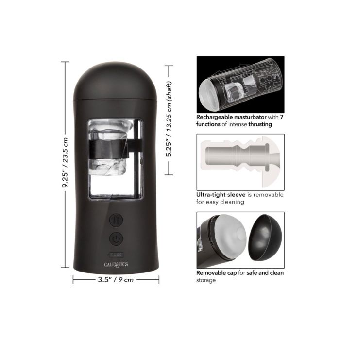 De Masturbator Bionic Stroking van CalExotics is een op zichzelf staande stotende masturbator gemaakt om de zintuigen te omhullen met een volledig aanpasbare streelervaring. Een ultradichte kamer met textuur wikkelt zich strak om je heen, terwijl 7 functies van intense stuwkracht zorgen voor een heerlijk hoogtepunt. Een ultradichte, ultrazachte, levensechte sleeve kan worden verwijderd voor reiniging of onafhankelijk van de stroker worden gebruikt. Door de afneembare dop is de masturbator perfect om mee te nemen op reis. Geniet van meer dan 60 minuten streelplezier op lage snelheid en laad de masturbator op in slechts 5 uur met de meegeleverde USB-kabel.