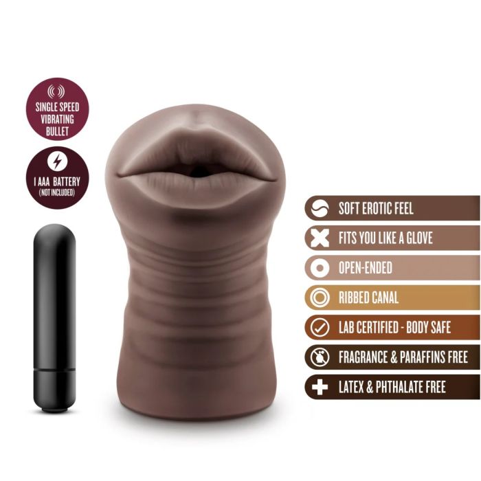 Ga voor een heerlijke blowjob met de Masturbator M for Men - Heather Chocolate. Met deze toy heb jij een heerlijke masturbator die jij kan gebruiken hoe jij wil. Vibrerend, niet vibrerend, met of zonder glijmiddel, in de slaapkamer, in de auto noem het maar op. Heather haar mond staat altijd voor jou klaar. Het zachte en soepele materiaal voelt aan alsof jij haar mond zal penetreren. De ingang heeft een realistische opening met volle ronde lippen. Wanneer jij je penis er doorheen hebt gestoken voel jij de heerlijke noppen en ribbels langs de schacht van je penis heen glijden. Dit geeft een extra prettig gevoel. Sluit je ogen en doe alsof jij een deep throat krijgt. De bullet is optioneel te gebruiken. Wanneer jij de bullet gebruikt steek jij het in de daarvoor bestemde opening. De bullet geeft een 1-speed vibratie die jij met de drukknop aan de onderkant aan en uit kan zetten. De sleeve is waterproof en dus makkelijk te reinigen, verwijder wel de bullet van de Masturbator M for Men - Heather Chocolate. om de sleeve te reinigen.
