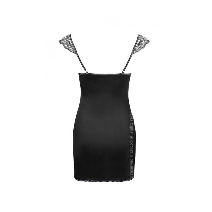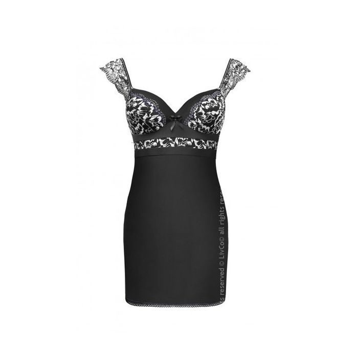De Meredia Chemise van Livco Corsetti is een tikkie conservatief en toch lekker sexy door het soepel vallende, gladde stofje. Dit nachtjurkje is een klassieke little black dress maar dan speciaal gemaakt om in de slaapkamer te dragen. De cups zijn niet gevoerd en uitgevoerd zonder beugels, zodat jouw borsten heel natuurlijk uitkomen in deze chemise. De cups zijn versierd met een zwart witte print welke terug komt in een rand onder de cups en in de vleugels aan de verstelbare schouderbandjes.