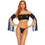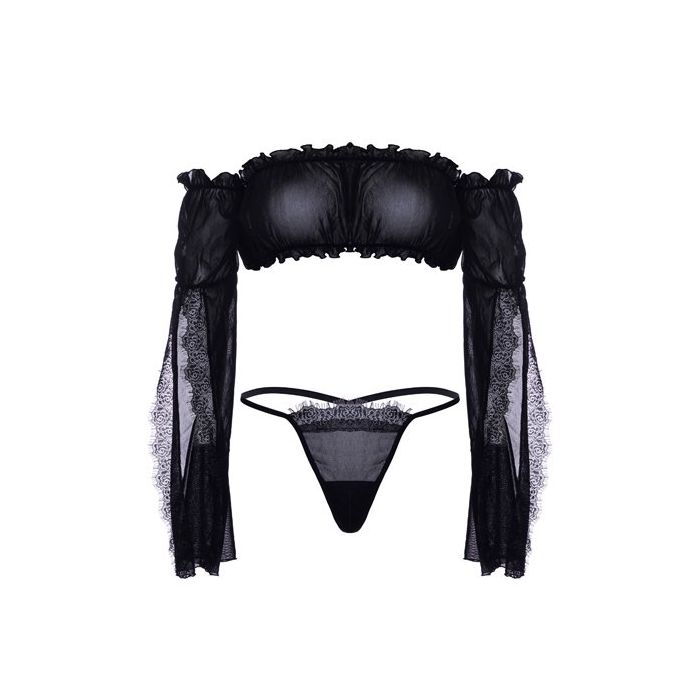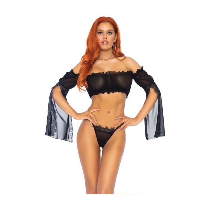 De bandeau top heeft rushes langs de randjes en lange mouwen. De lange mouwen vallen open door de splits voor een zwierig effect. De mouwen en de string zijn afgewerkt met vrouwelijk eyelash lace.