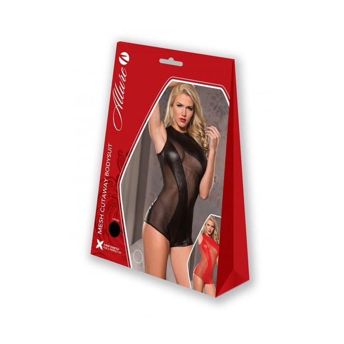De Mesh Cutaway Bodysuit is een sexy playsuit van het merk Allure. Deze speelse body is gemaakt van sexy wetlook materiaal gemaakt met form fitting technologie en 4-way stretch kwaliteit voor een perfecte pasvorm. Het wetlook materiaal is gecombineerd met doorschijnend mesh voor een stoere en sexy uitstraling.