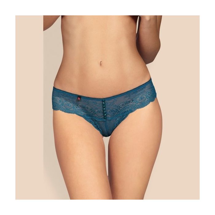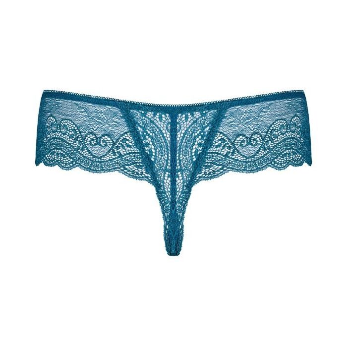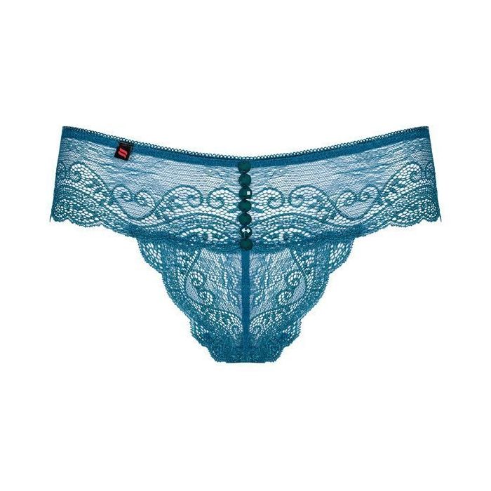 Je voelt je extra speciaal in de Miamor Kanten String - Turquoise uit de collectie van het merk Obsessive. Deze luxe string is gemaakt van sierlijk kant met multistretch kwaliteit met een bijzonder mooie turquoise kleur. De string heeft een mooi aansluitende pasvorm en een lage brede tailleband gemaakt van kant. Voorop de tailleband zijn glinsterende turquoise steentjes aangebracht en de randen van de string zijn geschulpt voor een extra romantische uitstraling.