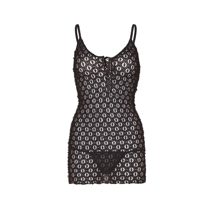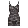 Dit tweedelige setje van het merk Leg Avenue bestaat uit een mini jurkje en een bijpassende string. Het korte jurkje is gemaakt van gehaakt materiaal met een opengewerkt design voor een licht-doorschijnend effect. Het jurkje is voorzien van spaghettibandjes en is afgewerkt met veters bij de buste voor de perfecte pasvorm. De string is wit en past daardoor perfect bij dit sexy jurkje.