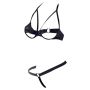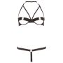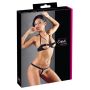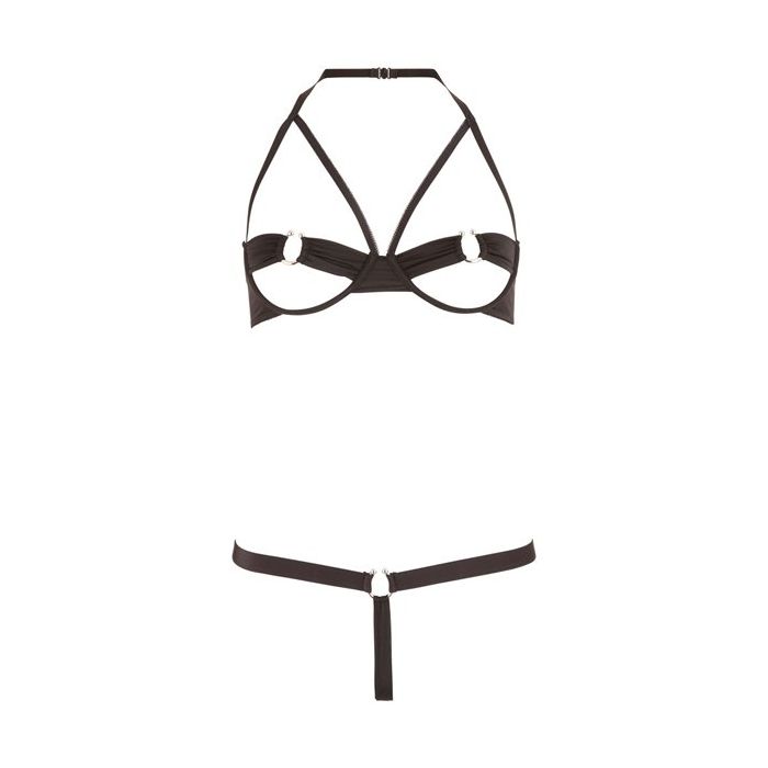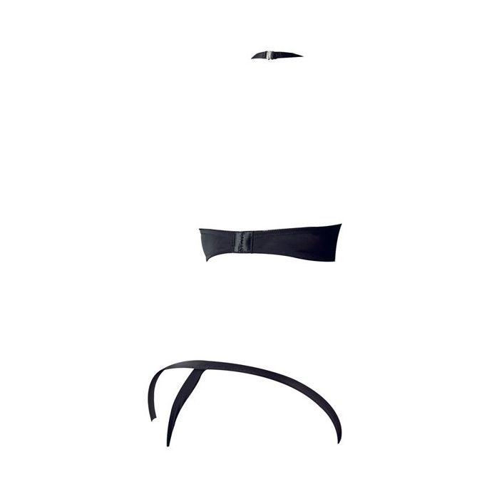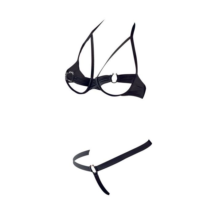 Deze minimalistische set laat weinig aan de fantasie te over. Deze set van Cottelli Collection bestaat uit een halter bh en een string gemaakt van zachte, elastische stof. De beugel bh heeft open cups met geplisseerde stof over het midden van de borsten. In het midden zijn metalen ringen voor om de tepels aangebracht. De bh heeft een handige haaksluiting op de rug en een clip in de nek. De sexy string heeft een elastische tailleband met een metalen ring in het midden. De string is een waar genot voor het oog want het kruis wordt alleen bedekt met een smal strookje stof. Je partner zal zijn handen niet van je af kunnen houden wanneer hij je in deze set ziet!