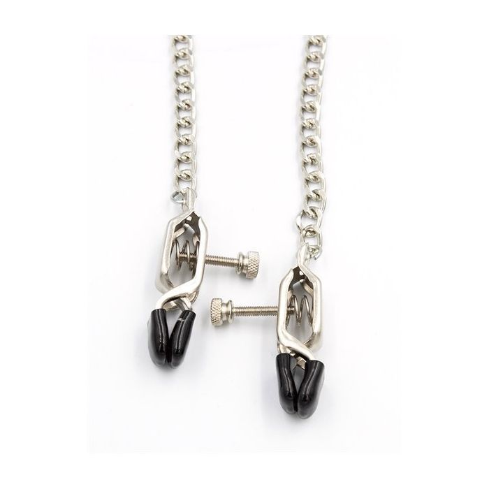 Deze tepelklemmen zijn met elkaar verbonden door de verstelbare stalen ketting. De zachte plastic doppen op de kaken verzachten de klemmen een beetje. Wil je je partner iets meer pijn doen? Trek dan aan de ketting wanneer te accuklemmen op zijn of haar tepels zitten.