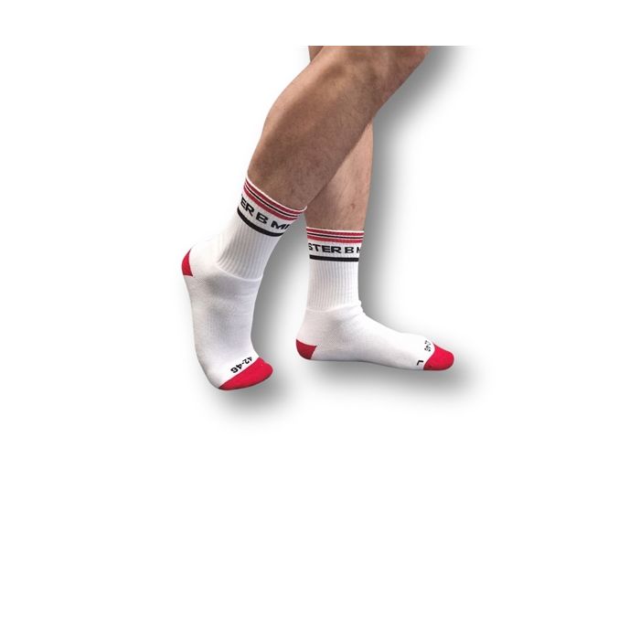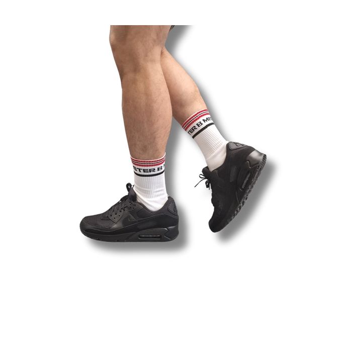 De Mister B Sport Sokken Fist Pig wit met rode accenten zijn perfect voor de avontuurlijke zielen die geen grenzen kennen. Deze gedurfde, kinky sokken zijn ontworpen om de aandacht te trekken en je identiteit te benadrukken, met 'FIST' op de ene zool en 'PIG' op de andere. De dikke, ademende stof zorgt voor comfort, terwijl de opvallende rode accenten bij de teen, hiel en enkelrand een vleugje ondeugendheid toevoegen. Met het iconische Mister B-logo op de boord, brengen deze sokken je 'filthy piggy pride' direct naar je voeten. Dus smeer je in, trek je gear aan en til die benen op—deze sokken spreken boekdelen!