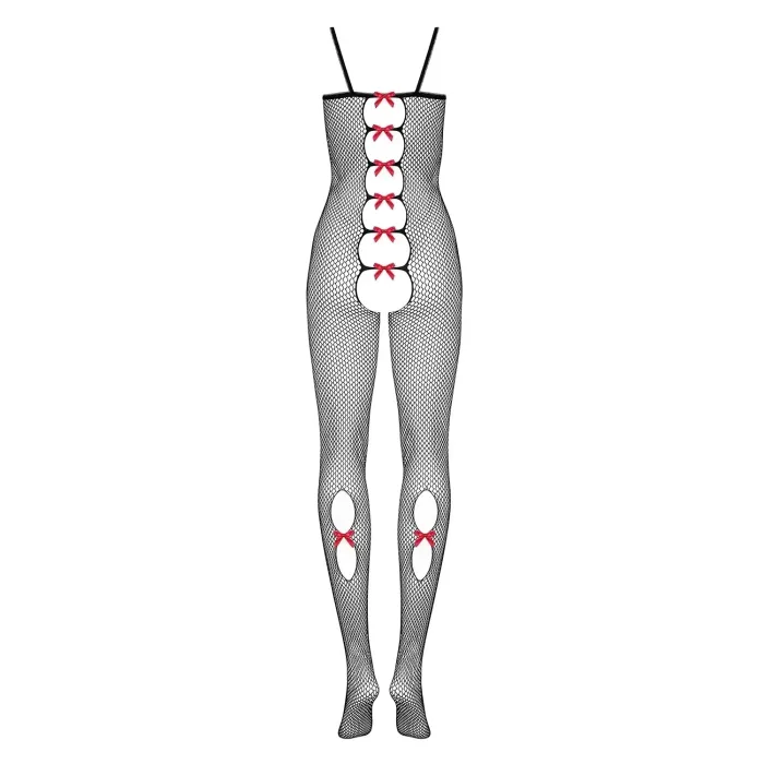 De N107 Bodystocking in het zwart is waar speelse zoetheid en een stoer karakter samenkomen! Deze verleidelijke bodystocking is vervaardigd uit zacht, elastisch mesh dat perfect om je lichaam valt en je silhouet prachtig accentueert. De provocerende oogjes op de rug en kuiten, versierd met satijnen, bloedrode strikjes, voegen een speelse flair toe die zeker de aandacht trekt. De charmante strikjes aan de voorkant onthullen subtiel je borsten en buik, terwijl de uitsparingen bij het kruis en de billen uitnodigen tot een speelse interactie. Met deze outfit voel je je niet alleen sexy, maar ook onweerstaanbaar begeerd. Perfect voor een speciale gelegenheid of een intieme avond, de N107 Bodystocking is de ideale keuze voor wie zijn of haar zelfvertrouwen wil laten stralen!