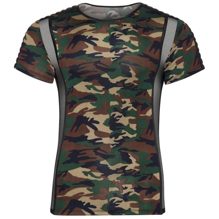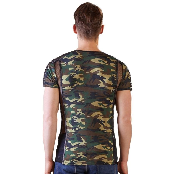 Voor de man die weet wat hij wil en niet bang is om het te laten zien. Dit geweldige camouflage shirt van het nieuwe merk NEK. Aan de voor en achterkant is het shirt geheel in camouflage stijl met over de schouders een glanzende stof die wat dikker is dan de rest van het stof zodat jij optisch wat bredere schouders krijgt. De zijkanten van het shirt heeft transparant visnet gaas inzetstukken voor een sexy look. De hals en zijkanten zijn afgewerkt met zwarte glanzende biesjes voor een nette afwerking.