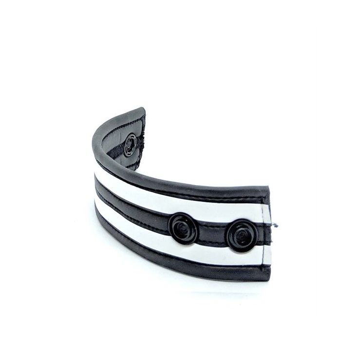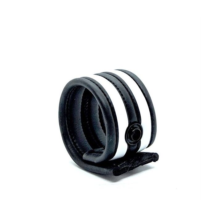 Ervaar een heerlijk strak gevoel rondom je ballen met deze witte neopreen Racer Ball strap van 665 Leather. Deze Racer Ball strap is in maat verstelbaar zodat je zelf kunt bepalen hoe strak je hem om je balzak zet. Je zet hem strakker of losser door middel van makkelijke druk knopen. Het neoprene materiaal is licht rekbaar en voel super zacht aan. De zwarte kleur met contrasterende witte strepen zorgt voor een stoere en mannelijke uitstraling. Met deze accessoire worden je ballen naar beneden getrokken en strak omhuld terwijl je zelf geniet van heerlijke stimulatie van je penis en eikel. Deze combinatie zorgt voor een onvergetelijk hoogtepunt dat je niet zo snel zal vergeten. De neoprene Racer Ball strap is volledig bodysafe en waterproof.