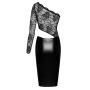 De jurk beschikt over een unieke asymmetrische kanten top die een opvallend visueel element toevoegt. Aan één kant is de top elegant aan de tailleband van de rok genaaid, wat een speelse maar verfijnde uitstraling creëert. De rok is ontworpen in een elegante knielengte, waardoor het een ideale keuze is voor diverse gelegenheden, van een chique diner tot een avondje uit. De Powerwetlook stof van de rok geeft een moderne twist aan het klassieke ontwerp, waardoor de jurk zowel trendy als tijdloos is.