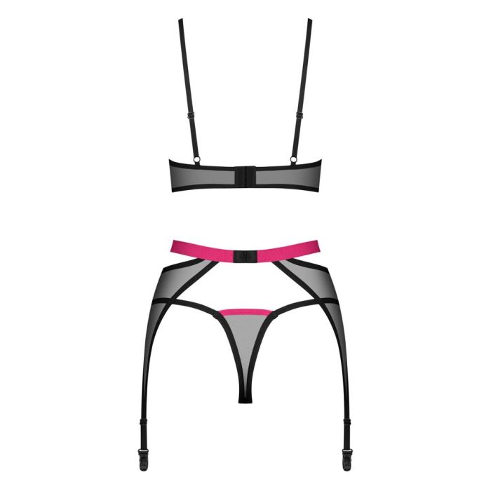 Dit 3-delige Straps-set Novenes van Obsessive is een verleidelijke lingerie set bestaande uit een soft-BH, een jarretelgordel en een V-string. Gemaakt van fijn zwart powernet met roze accenten, is dit setje perfect voor een avond vol passie en verleiding. De BH heeft decoratieve bandjes bij het decolleté en een prachtig strasselement tussen de zachte cups. De bandjes zijn verstelbaar, net als de haaksluiting aan de achterkant. De jarretelgordel is voorzien van een contrasterende tailleband en een ring aan de voorkant, wat zorgt voor een extra speels effect. De achterkant van de jarretel heeft ook een verstelbare haaksluiting en de jarretels zijn ook verstelbaar, zodat je je favoriete kousen kunt toevoegen voor een complete look. De bijpassende V-string maakt dit elegante transparante trio helemaal af. Gemaakt van 94% polyamide en 6% elastaan, voelt deze lingerie set zacht aan op de huid en zorgt voor een comfortabele pasvorm. Let op: de set wordt geleverd zonder kousen, dus zorg ervoor dat je je favoriete paar bij de hand hebt voor een complete outfit. Houd er rekening mee dat Obsessive een aparte maattabel heeft, dus zorg ervoor dat je de juiste maat kiest voor een perfecte pasvorm. Met dit 3-delige Straps-set Novenes van Obsessive voel je je ongetwijfeld sexy en zelfverzekerd. Of je het nu draagt voor een speciale gelegenheid of gewoon om jezelf te verwennen, deze lingerie set zal zeker de aandacht trekken en je partner betoveren. Laat je innerlijke godin stralen in dit prachtige en verleidelijke setje van Obsessive.