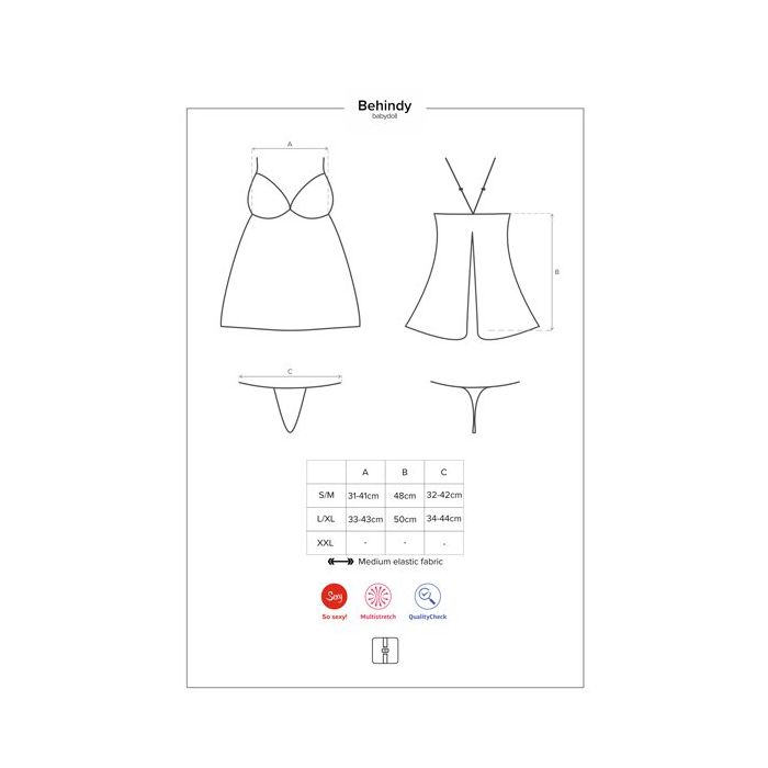 Trakteer jouw partner op iets lekkers in de Behindy Babydoll van Obsessive. De babydoll is gemaakt van doorzichtig kant van zachte stretch kwaliteit. De smalle verstelbare bandjes komen aan de achterzijde bijeen bij het rugpand. Daaronder is een grote satijnen strik aangebracht. Vanaf de strik loopt het romantische kant uiteen. Hierdoor worden jouw billen en de bijpassende string op spannende wijze zichtbaar.