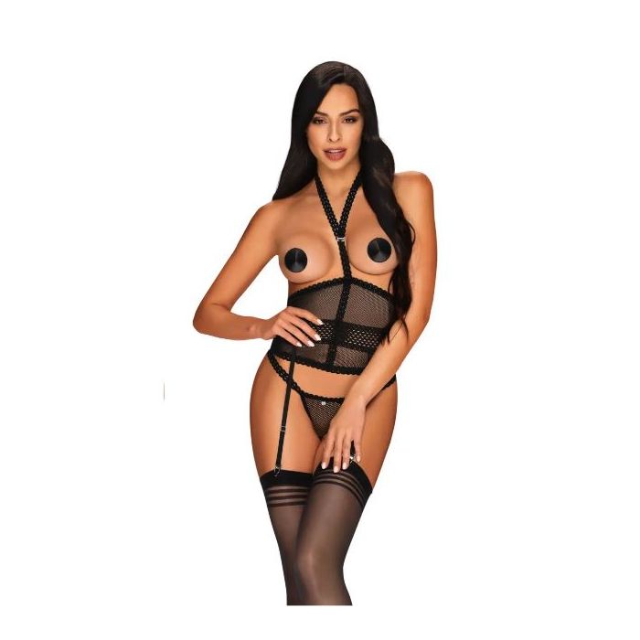 Ontdek een comfortabele én verleidelijke stijl! Dit prachtige jarretel korset en string van het bekende merk Obsessive is gemaakt van zacht materiaal. Hierdoor is de set zacht en elastisch voor maximaal comfort. De cups hebben beugels voor een perfecte ondersteuning en pasvorm. Dankzij het topless model heeft de set een sexy uitstraling. De jarretel bandjes zijn verstelbaar. De eenvoudige, mooie kanten string maakt deze verleidelijke look compleet.