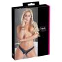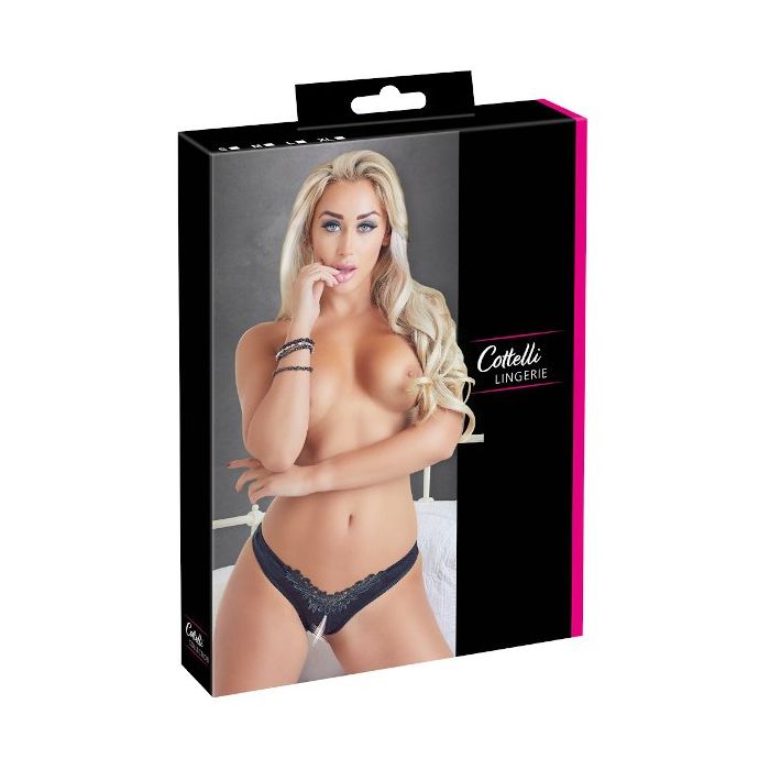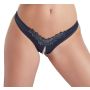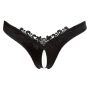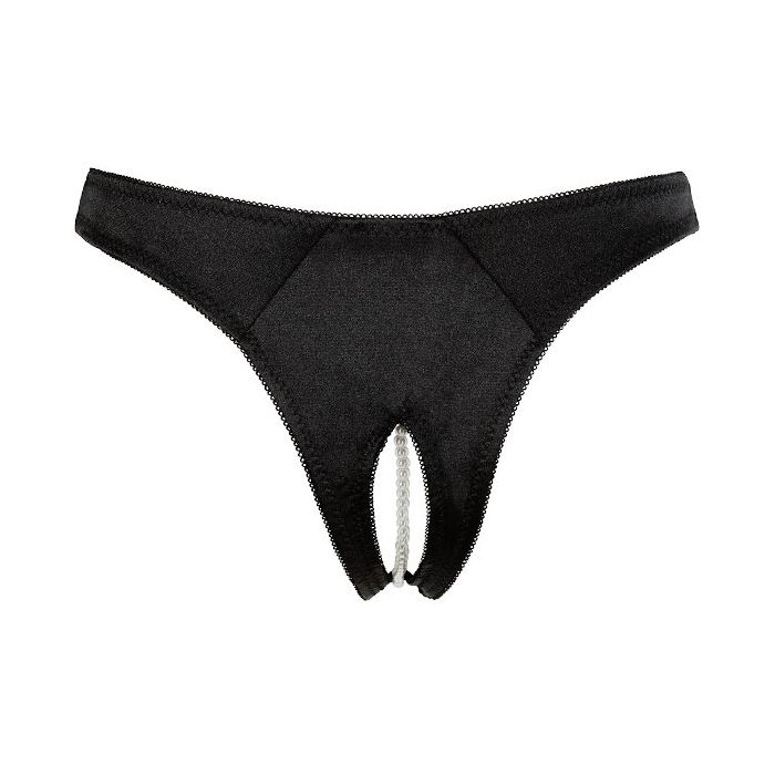 Geef je outfit een sexy boost met deze spannende open string. Hij is gemaakt van glanzend materiaal en net boven het kruis is een mooi kanten randje aangebracht in bloemenmotief. Over het kruis heen zit een witte kralenketting heen die bij elke beweging een overheerlijke sensatie zal brengen. Draag deze string om je partner in de mood te brengen of breng jezelf in de mood door deze sensationele string te dragen naar een feestje onder een sexy jurkje.