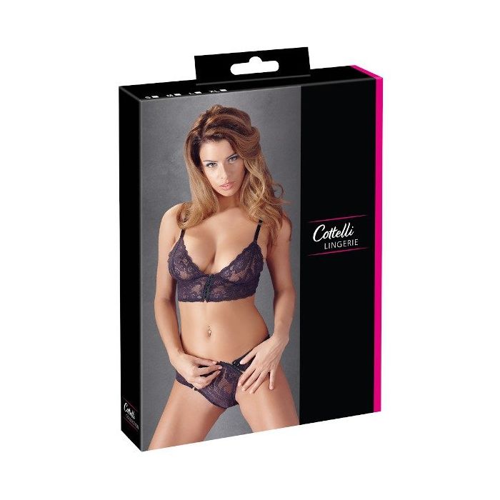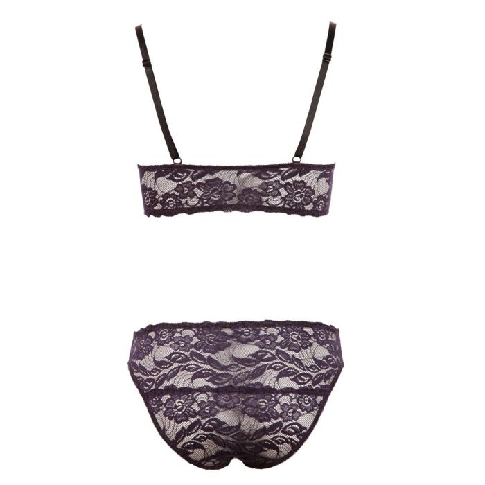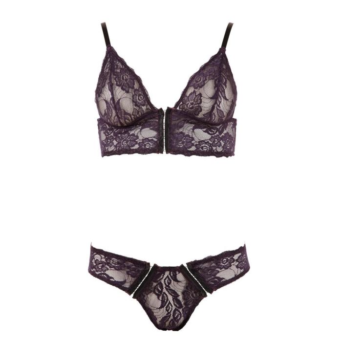 Dit verleidelijke lingeriesetje mag niet ontbreken aan jouw lingerie collectie. Deze prachtige set uit de Cottelli Collection bestaat uit een BH en slip en zijn gemaakt van paars kant met een sierlijke print. De BH heeft verstelbare bandjes en de driehoekige kanten cups hebben geen beugels voor een nonchalante look. Zowel de BH als de slip hebben haaksluitingen aan de voorkant zodat jouw partner jou gemakkelijk uit dit setje kan helpen.