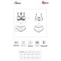 De bralette top heeft geen beugels en verleidelijk doorschijnende cups. De top begint al rond de hals met een choker van kant. Het kant komt terug aan de schouderbandjes, in de cups en onder de cups. Onder de cups loopt de bralette door in een longline model. Baleinen in de zijkanten zorgen ervoor dat de stof niet omhoog krult. Over de voor- en achterkant lopen smalle bandjes en op de rug is een dubbele haaksluiting ingezet. De hipster zit laag om de heupen en romantische details.