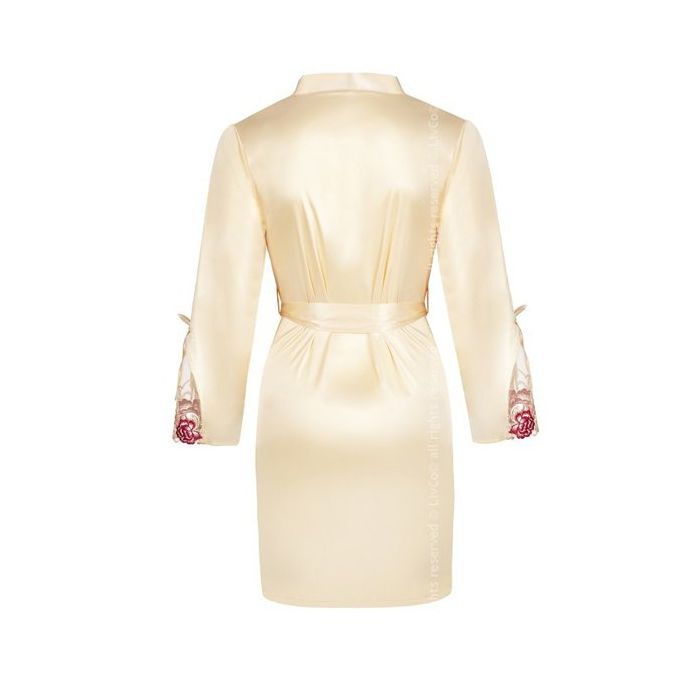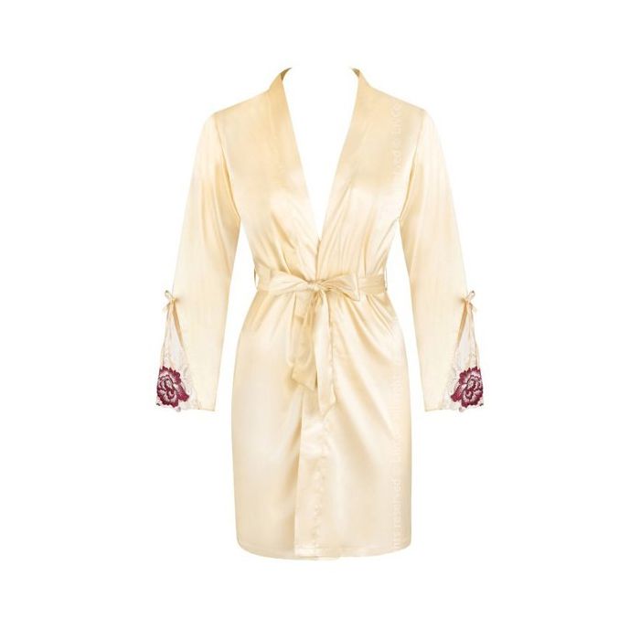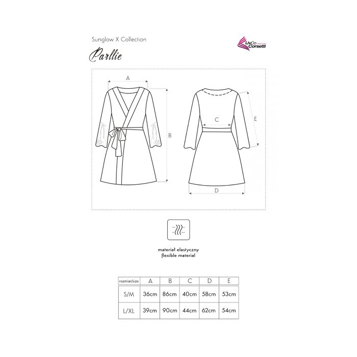 De kamerjas heeft een kort model en een soepele pasvorm. In de lange mouwen zijn micro mesh inzetten aangebracht met prachtig geborduurde bloemen. De Parllie Kamerjas heeft een brede boord net als een kimono en de kamerjas wordt geleverd met een satijnen strik ceintuur.