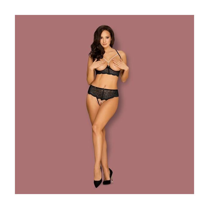 Laat jouw best features super sexy uitkomen in de Pearlove Open BH en Open String set van Obsessive! Deze tweedelige set is gemaakt van sierlijk bloemen kant van hoge kwaliteit met stretch. De lingerie set is afgewerkt met verleidelijke parelkettingen en luxe details.