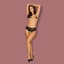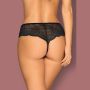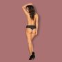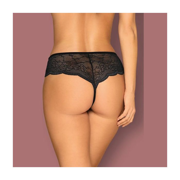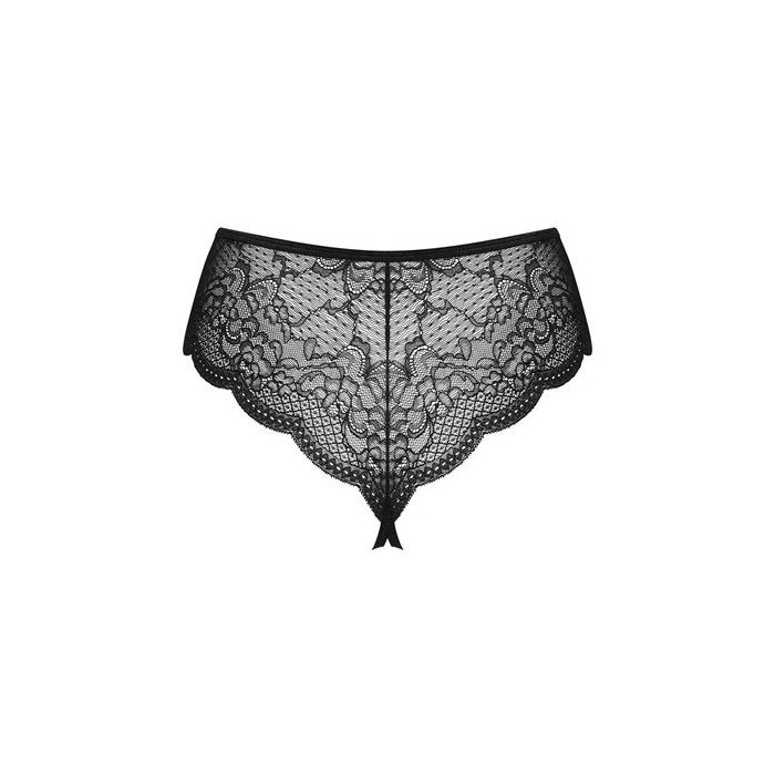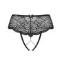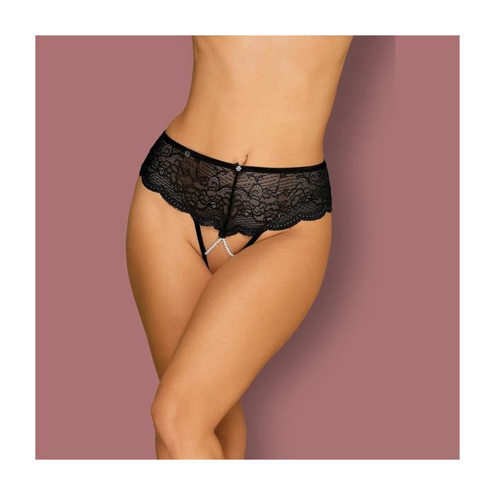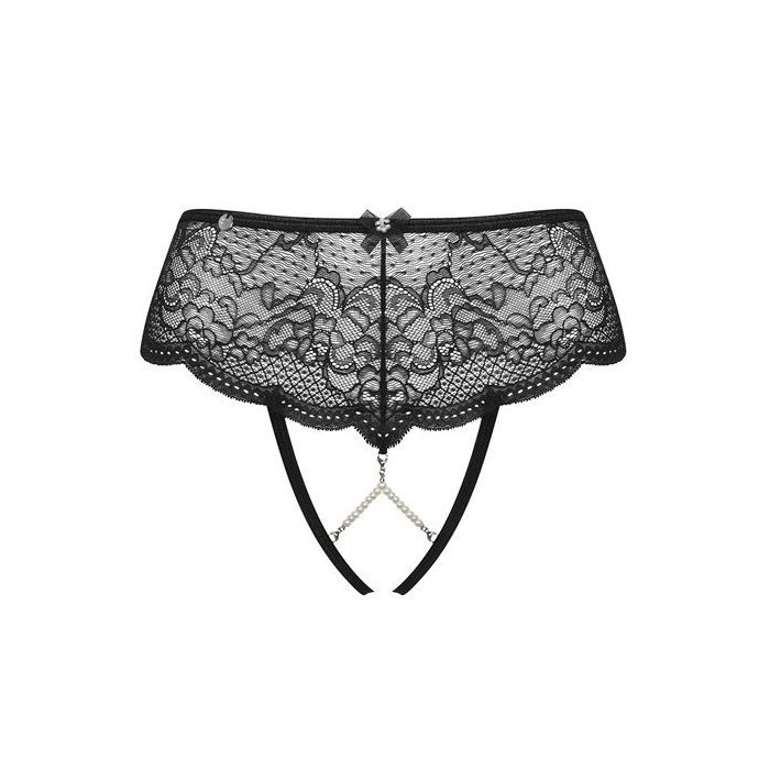 Aan de voorkant lopen smalle bandjes langs het uitdagende open kruis. Tussen het kant en de smalle bandjes zijn parel kettinkjes gespannen. Aan de achterkant worden de billen prachtig omlijst en benadrukt door de geschulpte randen.