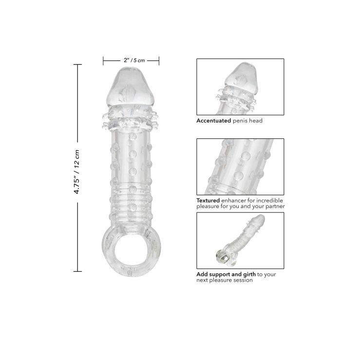 Je penis verlengen via ingrijpende operaties? Helemaal niet nodig met de Ultimate Stud Extender - Transparant van Calexotics. Deze fijne penis sleeve is gemaakt van soepel TPE en verlengt letterlijk en figuurlijk jullie liefdesspel. De Ultimate Stud Extender is 16 cm lang en heeft een inbrengbaar binnengedeelte van 11 cm. Dit betekent dat je penis met wel 5 cm verlengt wordt! Maar dat is niet het enige. De cockring zorgt voor een langer uithoudingsvermogen van hem en de noppen en studs die op de cockring en schacht zitten zorgen voor extra stimulans voor haar. Dankzij de handige scrotumband blijft de penis sleeve goed op zijn plek zitten. Met dit veelzijdige speeltje tussen de lakens komen jullie in elk opzicht nader tot elkaar.