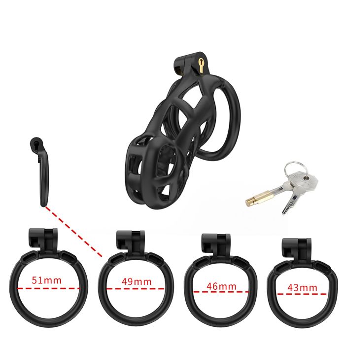 Je kunt kiezen tussen verschillende diameters, namelijk 43 mm, 46 mm, 49 mm en 55 mm, om zo de beste pasvorm te vinden die bij jou past. De CELLMATE Guardian Chastity Cage wordt geleverd met zowel een traditioneel metalen slotje met 2 sleutels, als met een speciale ABS-kunststof adapterpin, waarmee je de kooi in Stealth-modus kunt sluiten met een van de vijf plastic sloten, elk voorzien van een unieke fraudebestendige identificatiecode.