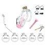 Een opvallend kenmerk van de Guardian peniskooi is de roze, pussyficerende siliconenkatheter, die niet alleen esthetisch aantrekkelijk is, maar ook functioneel. Deze flexibele, klinkende plug heeft een unieke opening die het mogelijk maakt om te urineren zonder de kooi te hoeven verwijderen, wat bijdraagt aan het gebruiksgemak en de discretie. Bovendien wordt de Guardian Chastity Cage geleverd met zowel een traditioneel metalen slot met twee sleutels als een speciale ABS-kunststof adapterpen. Deze adapterpen maakt het mogelijk om de kooi in Stealth-modus te vergrendelen met een van de vijf kunststof sloten, elk voorzien van een unieke sabotagebestendige identificatiecode, wat het ideaal maakt voor gebruik tijdens reizen of in situaties met metaaldetectors. Reservesets van tien wegwerpsloten zijn ook apart verkrijgbaar, waardoor gebruikers altijd voorbereid zijn.