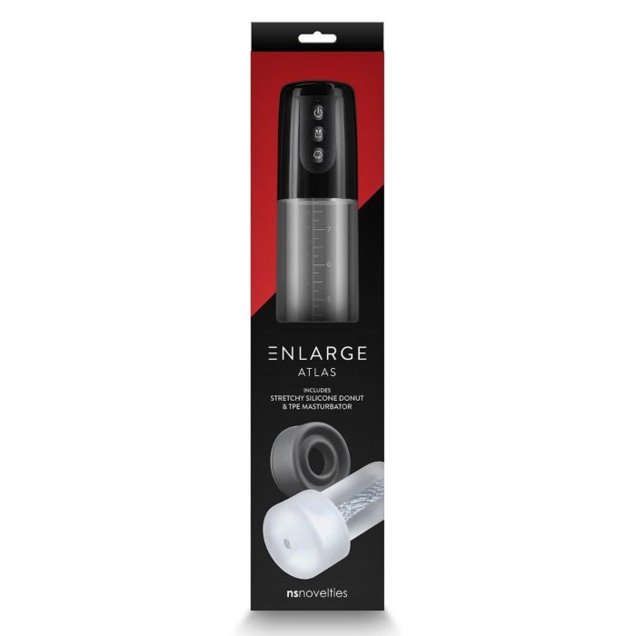 De Penispomp Enlarge Atlas Pump van NS novelties heeft 3 pomp snelheden en werkt op 3 AAA batterijen. De batterijen worden niet meegeleverd. Hij is gemaakt van ABS, TPE en siliconen. De Enlarge Atlas bevat een elastische siliconen donut en een TPE-masturbator. Daarnaast is de acrylbuis met meetindicator eenvoudig schoon te maken en te onderhouden.