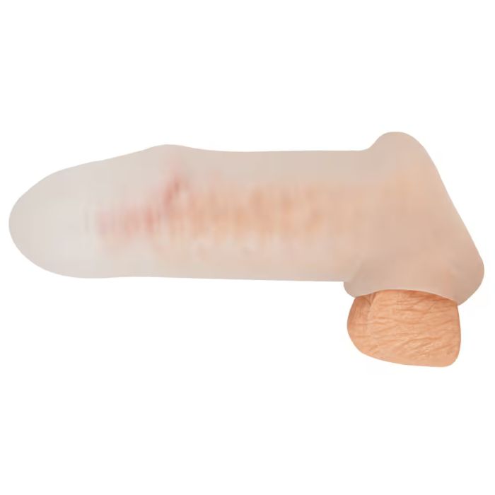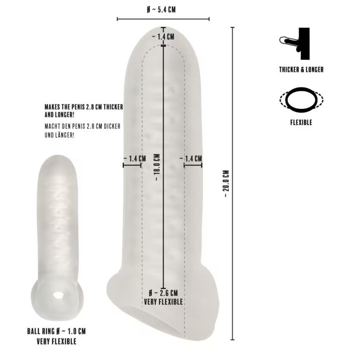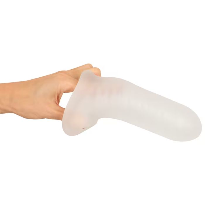 Deze innovatieve penissleeve is ontworpen om je penis snel en eenvoudig te vergroten, waardoor je kunt genieten van vullende en opwindende ervaringen. Met een indrukwekkende toename van 1,3 cm in dikte en lengte, voel je het verschil direct. De elastische, transparante sleeve glijdt moeiteloos over je penis en biedt een perfecte pasvorm dankzij de stimulerende groeven aan de binnenkant. Deze zorgen voor een heerlijke wrijving en een anti-slip effect, zodat je je geen zorgen hoeft te maken over de sleeve tijdens de meest intense momenten.