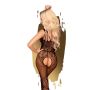 Deze netstof bodystocking is gemaakt van fijn geweven nylon, waardoor iedere aanraking extra geil aanvoelt. In het fijnmazige netstof zijn sierlijke patronen verweven van bloemen en bladeren. Boven de knieën zijn strikken verweven in de stof en op de onderbenen een speels ruiten patroon. De bodystocking heeft shredded look schouderbandjes en een uitdagend open kruisje!