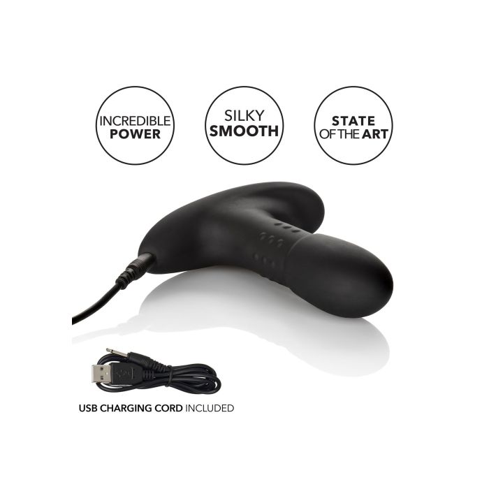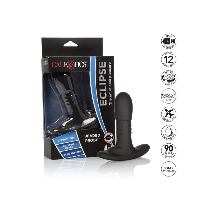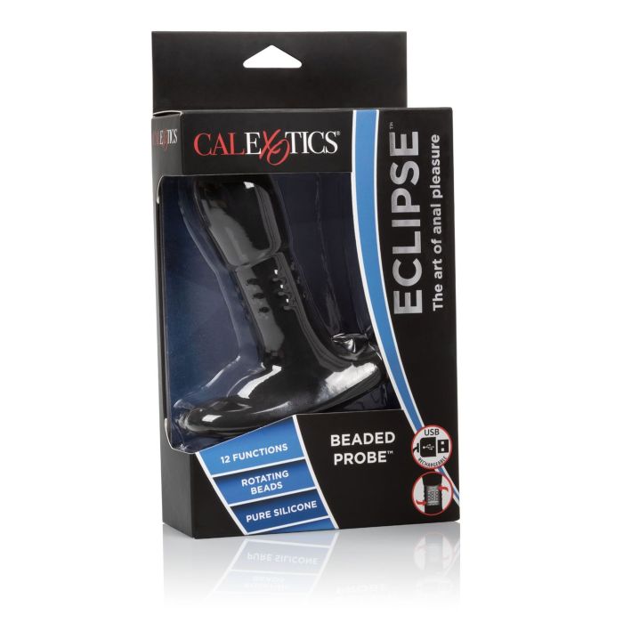 Met een prostaat vibrator je prostaat stimuleren geeft je seksleven een enorme boost. De prostaat is heel gevoelig en het stimuleren van je prostaat met de juiste toy is een geweldige ervaring. Geniet van intense orgasmes met deze Eclipse prostaat vibrator met roterende beads van het merk Calexotics. De Eclipse heeft een stotende functie en een roterende bal in de top. Dit in combinatie met de perineum stimulator zal je doen kronkelen van genot. Ontdek alle 12 standen die dit speeltje van zacht zwart siliconen te bieden heeft. Je kunt zowel samen als alleen van deze alleskunner genieten. Na gebruik laad je de Eclipse gemakkelijk in 90 minuten weer op voor een gebruikerstijd van 45 tot 60 minuten. Enjoy the ride!