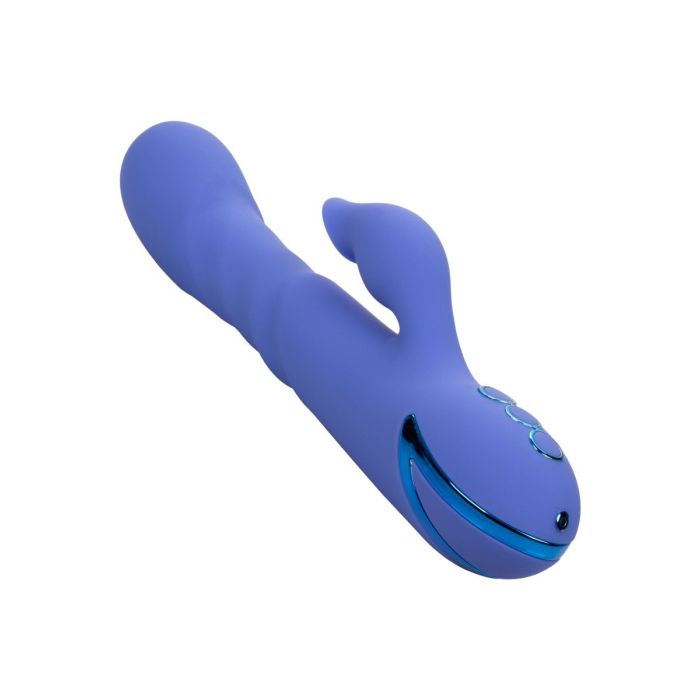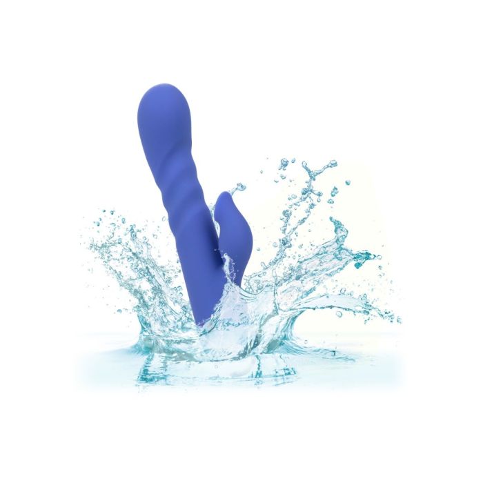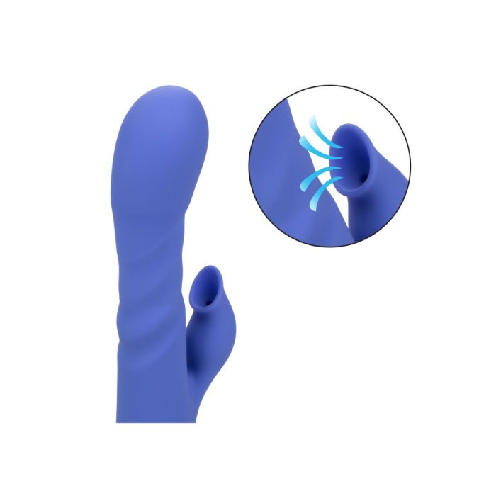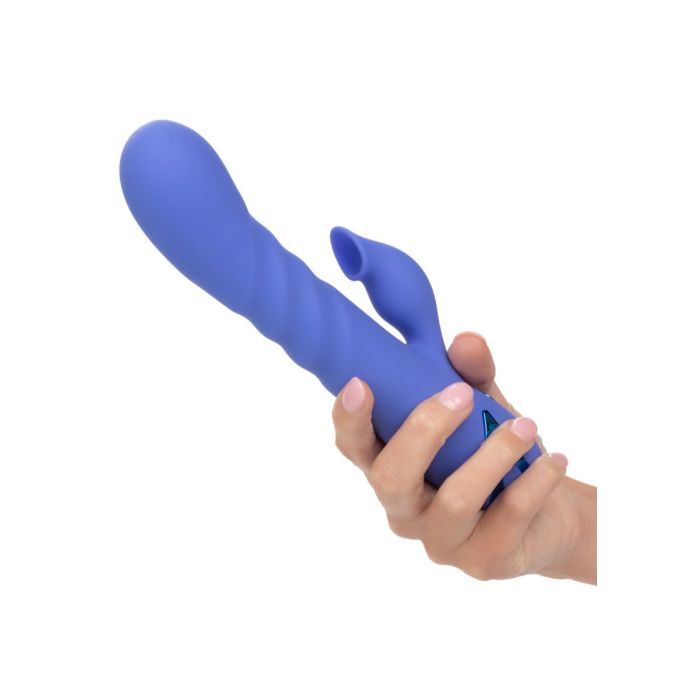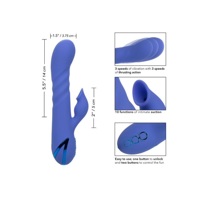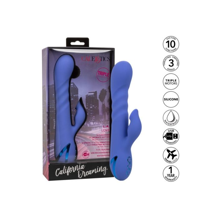 Met de Rabbit Vibrator L.A Love van CalExotics ben jij klaar om je favoriete fantasieën opnieuw te beleven met 10 functies van intieme zuiging gecombineerd met 3 snelheden van onafhankelijke vibratie en stotende actie. De sensuele schacht heeft 3 snelheden van stuwkracht en trillingen om ervoor te zorgen dat je altijd de juiste plek raakt. De clitoris stimulator heeft 10 zuigfuncties die je gemakkelijk kunt bedienen op het speeltje zelf. De hightech geheugenchip onthoudt precies hoe je het leuk vindt en hervat het afspelen met de laatst gebruikte functie. Laad de vibrator op met de bijgeleverde oplaadkabel in 2.5 uur en helemaal opladen geniet je maximaal 90 minuten van de heerlijke standen.