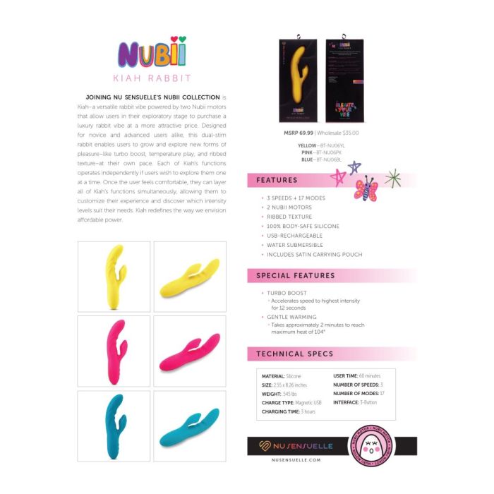 De Rabbit Vibrator Nubii Kiah van Nu Sensuelle heeft 2 krachtige motoren, 17 heerlijke vibratiestanden, verwarmingsfunctie en turboboost. Je kunt de verschillende standen gemakkelijk bedienen op de vibrator zelf. Daarnaast kun je alle functies met elkaar combineren. Geen gedoe meer met batterijen, want Nubii Kiah is oplaadbaar met de meegeleverde USB oplaadkabel. Het siliconen materiaal voelt zijdezacht aan en is gemakkelijk schoon te maken met een toycleaner.