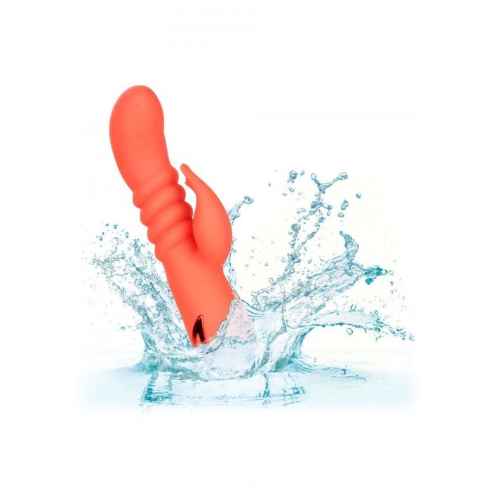 Rabbit vibrator Orange County Cutie van het merk Calexotics ziet er niet koninklijk uit, maar gaat jou ook royaal verwennen en orgasmes van de hoogste orde bezorgen. Deze koninklijke vibrator heeft een ergonomisch ontwerp en tal van eigenschappen die gegarandeerd een hoop plezier tussen de lakens of in bad oplevert. Want de Orange County Cutie is waterproof, gemaakt van zacht siliconen en heeft maar liefst 10 vibratiestanden en 3 stotende snelheden. Ontdek jouw favoriete standje, terwijl de ribbels op de schacht voor intense vaginale stimulatie zorgen.
