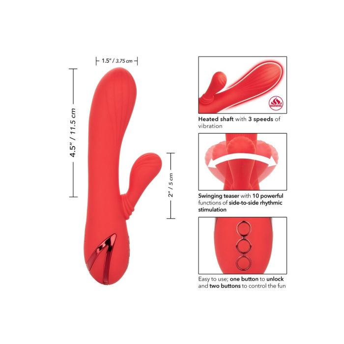 Geef jezelf over je wildste fantasieën en voel de hitte stijgen met deze gloeiend hete Rabbit Vibrator Palisades Passion. Ervaar plezier als nooit tevoren met de unieke swingende teaser met 3 snelheden. De luxe verwarmde konijnenvibrator heeft een unieke zij-aan-zij ritmische stimulator voor verbluffende externe stimulatie. Of je nu het vuur hoger wilt zetten met je lover of gewoon wilt genieten van een hete solo-tijd, deze verrukkelijke verwarmde stimulator wacht op je. De ongelooflijke verwarmende stimulator bereikt een maximale rustgevende temperatuur in slechts 3 minuten voor een opwindende tijd alleen of samen. De ritmische side-to-side teaser-functies zorgen voor adembenemende clitorale stimulatie, terwijl de voorgevormde schacht jou zal verwennen met rommelende vibrators. Bedien en pas je speelplezier aan met de onafhankelijk geregelde vibratie- en stimulatorfuncties. Laad de stimulator in 2,5 uur op met de meegeleverde USB-oplaadkabel om te genieten van 45 minuten stimulatie op hoge snelheid of 90 minuten trillingen op lage snelheid.
