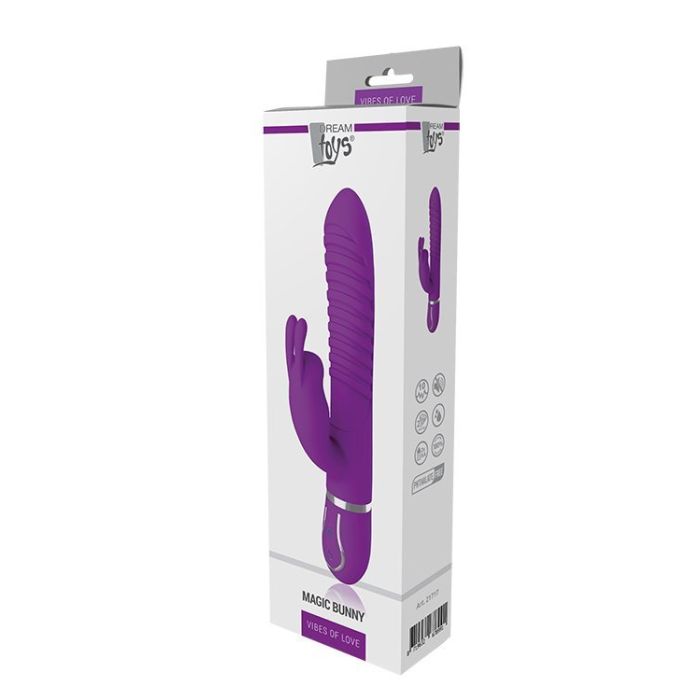 Laat je intens verwennen door deze vrolijke paarse rabbit vibrator Vibes Magic Bunny van Dreamtoys. De vibrator is stevig en zacht tegelijk en zorgt gegarandeerd voor de nodige magie tussen de lakens. De Dreamtoys Magic Bunny heeft een lengte van 22 cm, diameter van 3,5 cm en een stimulerende geribbelde schacht. Breng hem in met wat glijmiddel op waterbasis voor een extra soepel verloop en ontdek de 10 verschillende vibratiestanden die dit veelzijdige speeltje te bieden heeft. De tikkende konijnen oortjes zorgt voor optimale externe stimulatie en dankzij de dubbele motor zijn alle standen zeer krachtig, maar stil in gebruik. Rabbit vibrator Vibes Magic Bunny is waterproof en gaat ook graag met je mee in bad of onder de douche.