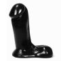 Fraai gevormde, rechte, zwarte dildo met gladde schacht en dikke eikel. Door de relatief platte balzak is dit model eventueel ook te gebruiken in een strap-on. Met zijn 13 cm is hij even lang als de gemiddelde penis. Deze fijn gevormde dildo van All Black is gemaakt van vinyl. De meeste heren (en ook dames) prefereren de zachtere vinyl dildo's boven de rubberen dildo's. Dildo’s die gemaakt zijn van vinyl hebben namelijk een aantal voordelen: ze zijn goed bestand tegen glijmiddelen op olie- of vetbasis, daarnaast zijn ze geurloos en gemakkelijk te reinigen met, bij voorkeur, een toycleaner.