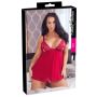 Voor een liefdevolle nacht draag jij deze schitterende Rode Babydoll met Open Cups. De babydoll heeft een wijd uitlopend model vanaf de onderkant van de borsten en is dubbellaags. De cups zijn dicht te strikken maar ook open te dragen om de spanning op te bouwen. De schouderbandjes zijn verstelbaar voor de juiste pasvorm. Draag de Rode Babydoll met Open Cups met stijl en verras je lover op een aangename manier.