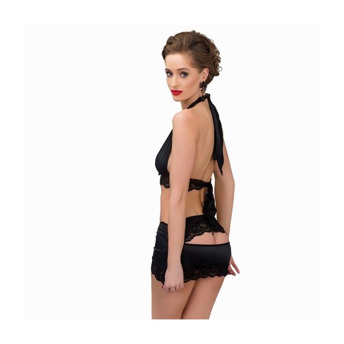 Een sexy halter top en een lekker strak mini rokje. De perfecte combinatie voor een avond vol passie! De Sally Set - Zwart komt uit de collectie van TET Lingerie. De top en het rokje zijn beiden gemaakt van hoogwaardige materialen. Het glanzende satijn en het bloemen kant geven samen een charmante look.