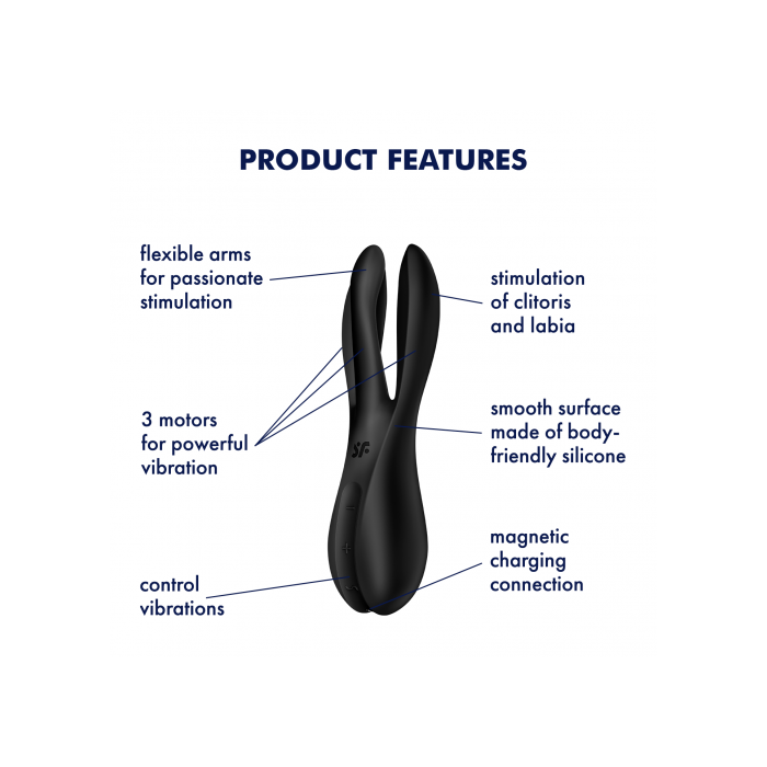 Deze veelzijdige vibrator is op vele manieren te gebruiken. De Satisfyer Threesome 2 beschikt over drie flexibele voelsprieten waarmee je verschillende spots kunt stimuleren zoals de clitoris, schaamlippen en tepels. De vibrator heeft drie motoren die de gebruiker verrast met sterke en diepe vibraties. Blader door maar liefst 12 vibratieprogramma's en ontdek welk standje jouw favoriet wordt. De Satisfyer Threesome 2 is gemaakt van zijdezacht flexibel siliconen en heeft een waterdicht ontwerp zodat je onder de douche heerlijk kunt genieten van jouw nieuwe aanwinst. Threesome 2 is oplaadbaar via de meegeleverde magnetische usb-kabel.