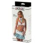 De set bestaat uit een bikini top met triangel cups, een boord met stropdas en een geplooid mini rokje. Het topje heeft verstelbare schouderbandjes en een striksluiting tussen de cups. Het brede witte kraagje heeft een knoopsluiting aan de voorkant en een aangehechte stropdas. De stropdas heeft een blauwe, ruiten print die terugkomt in het rokje. Het mini rokje zit lekker laag en is lekker kort.