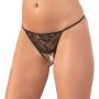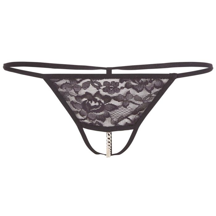 Ben je op zoek naar een super spannende string met open kruis? Dan zit je bij deze string uit de Mandy Mystery Line helemaal goed! Deze zwart kanten string heeft dunne bandjes en een opwindend open kruisje. Door het open kruis is een zilveren kettinkje gespannen. Het kettinkje zal heerlijk tussen je schaamlippen bewegen en je zachtjes masseren. Draag deze string stiekem onder je kleding naar werk of wanneer je een gezellige avond met je partner hebt gepland.