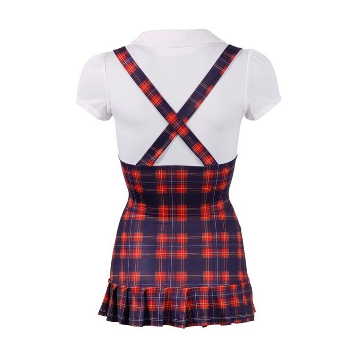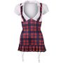 Het rood en blauw geruite Sexy Schoolmeisje Kostuum heeft een speels kraagje, korte mouwen, een aangehecht geplisseerd rokje, aangehechte bretels en aangehechte jarretelbandjes om te combineren met maagdelijk witte kousen.