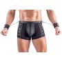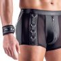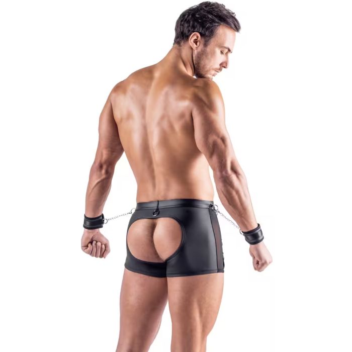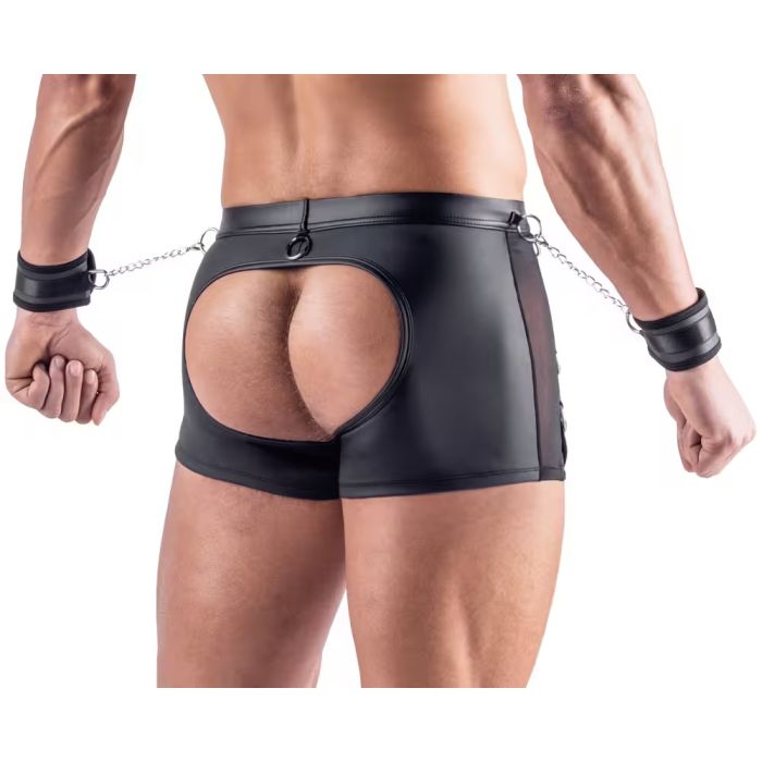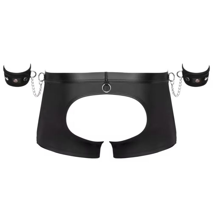 De bijgeleverde zachte handboeien maken dit broekje tot een must-have voor de avontuurlijke geest. De manchetringen aan de beklede tailleband en de zijkanten bieden de mogelijkheid om de handboeien snel vast te haken met hun karabijnkettingen, zodat je in een handomdraai klaar bent voor actie. De verstelbare klittenbandsluitingen van de handboeien zorgen ervoor dat je de perfecte pasvorm kunt creëren, wat bijdraagt aan het comfort en de opwinding.